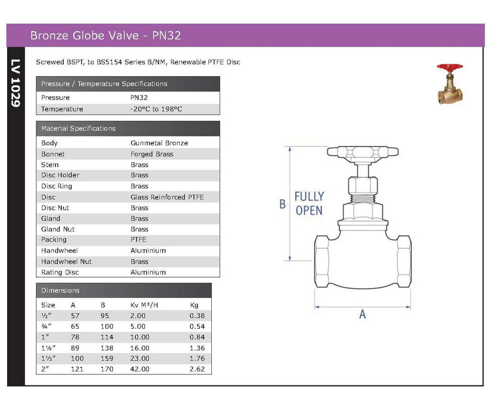 Screwed BSPT, to BS5154 Series B/NM, Renewable PTFE Disc.Rated PN32, Temperature -20°C to 198°C.