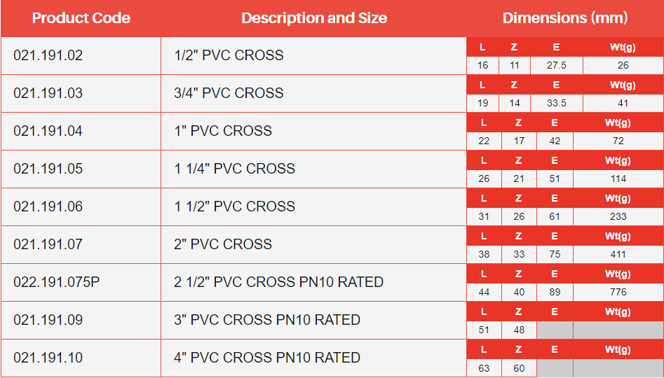 PVC Imperial Cross with plain ends for use with imperial PVC pressure pipe systems. Use this product to connect four pipes of the same size in diameter.